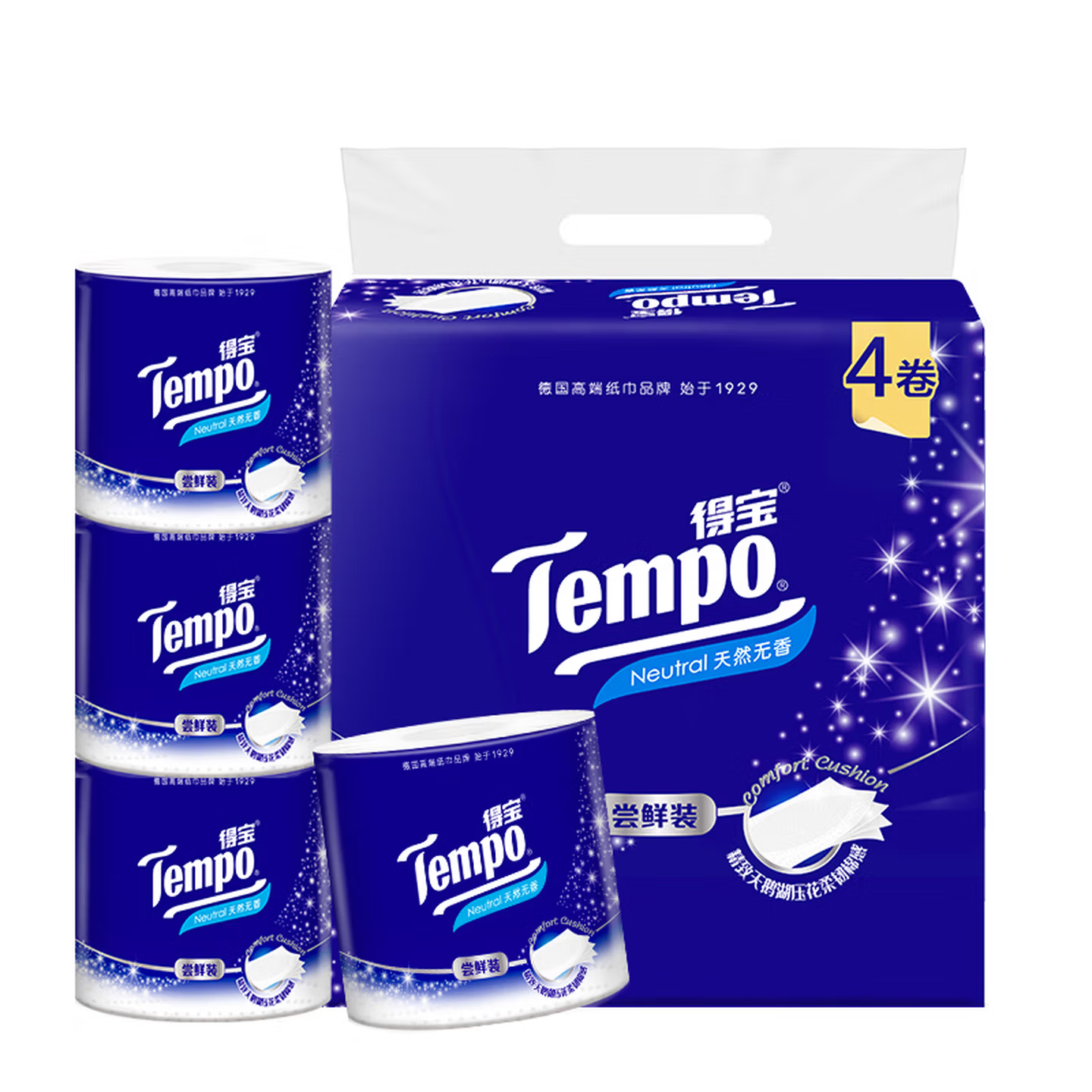 得宝(TEMPO)卷纸,135g厚实克重,4层加厚设计,柔韧耐用不掉屑。源自德国品质,4卷实惠装,湿水不易破,呵护全家日常所需。