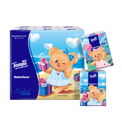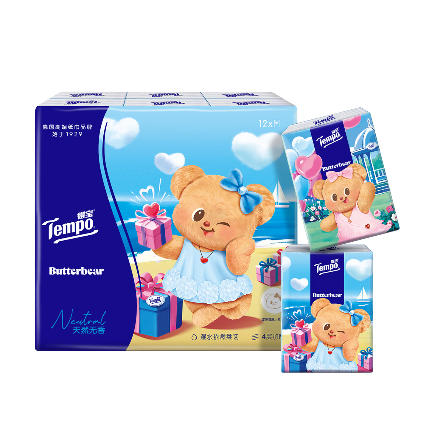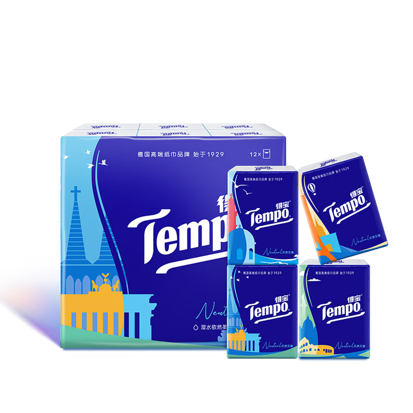 得宝(TEMPO)手帕纸,德国高端纸巾品牌,始于1929年,品质与设计兼具。所有款式均采用100%原生木浆,4层加厚设计,湿水依然柔韧,不掉纸屑,适合各种场合使用。