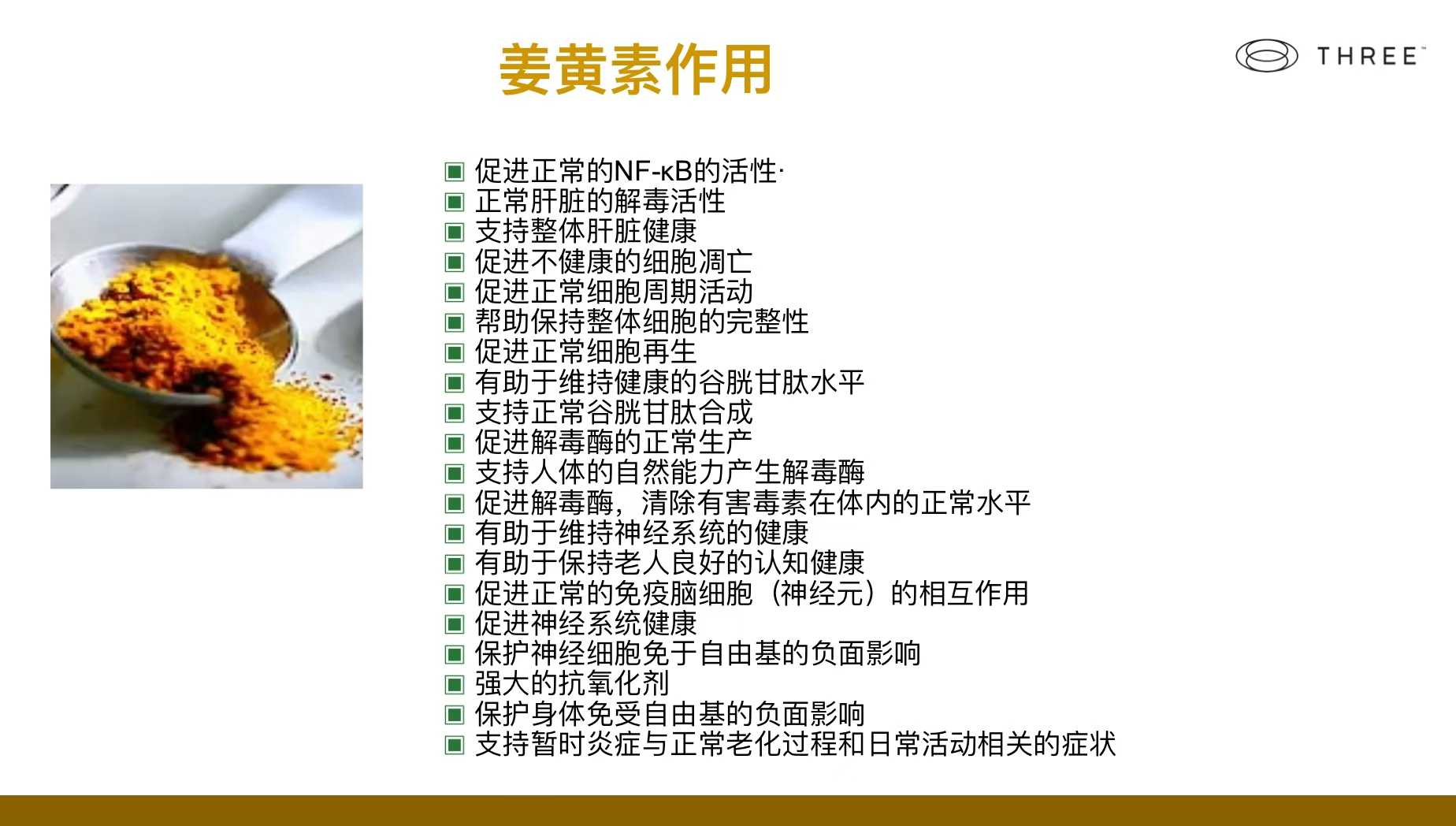 1.促进神经和认知能力的健康。因为姜黄素能透过血脑屏障,并支持脑部B-淀粉样蛋白(amyloid-beta))的正常吸收,尤其当我们逐渐老化时,能支持脑的记忆和学习能力。